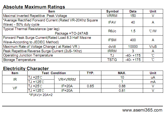 MBR40150PT肖特基二极管相关型号:MBR40200PT、MBR40100PT、MBR4060PT