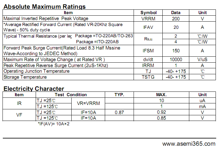 MBR20200PT肖特基二极管相关型号:MBR20200PT、MBR30200PT、MBR40200PT