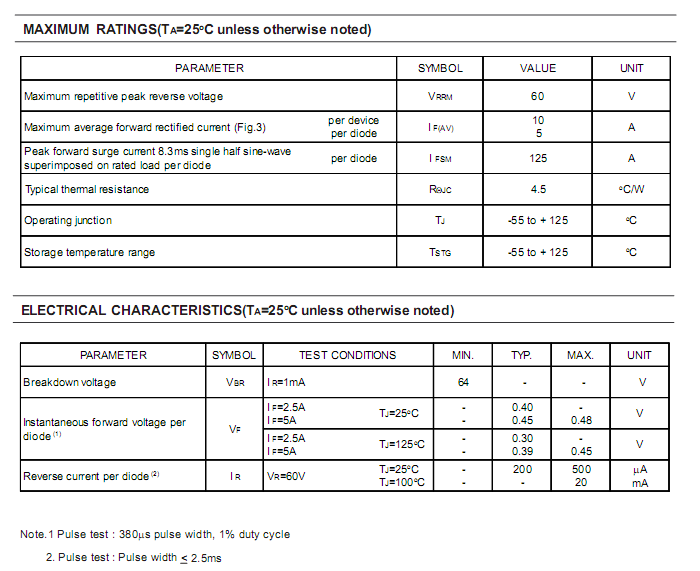 SB1060LFCT工作温度范围:-40°C to +150°C