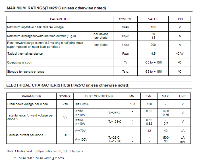 SB30100LFCT工作温度范围:-40°C to +150°C