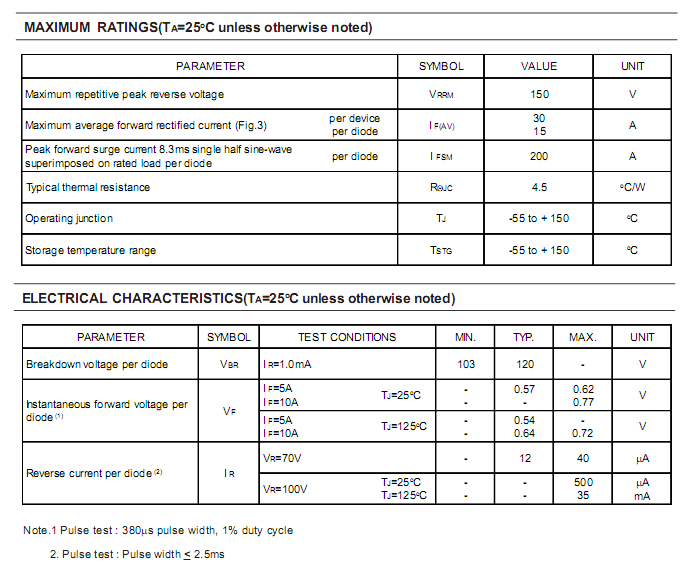 SB30150LFCT肖特基系列型号:SB3045LFCT,SB3060LFCT,SB30100LFCT,SB30150LFCT