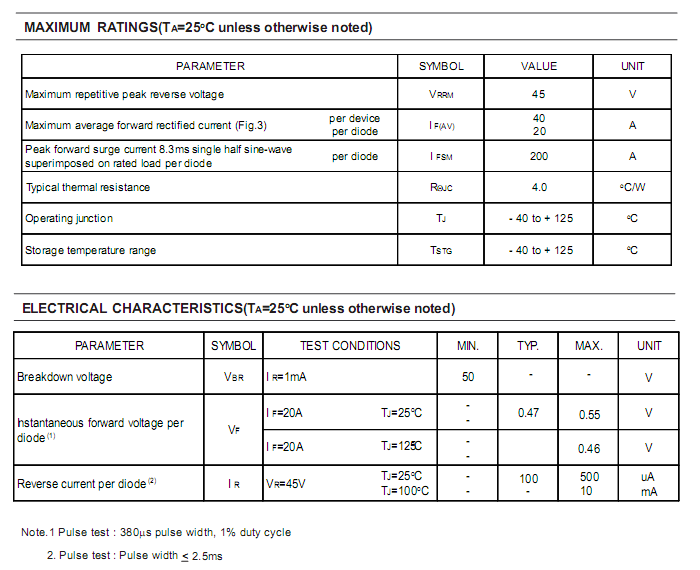 SB4045LFCT正向压降Vf :0.46V