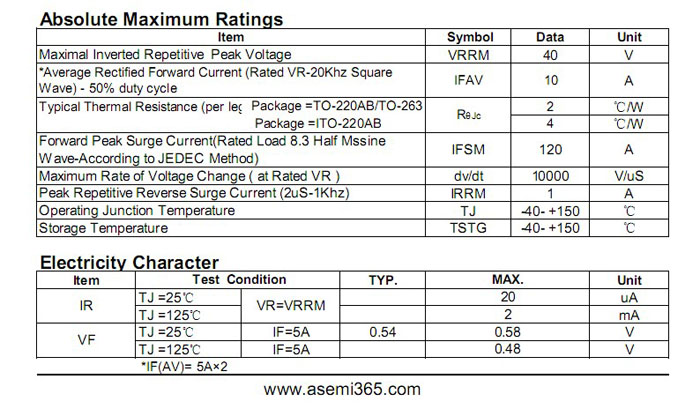 MBR1040CT肖特基相关参数如下: