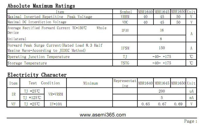 MBR1645CT ITO-220AB肖特基二极管PDF资料