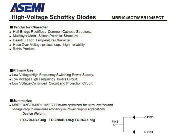 ASEMI肖特基二极管MBR1045FCT 中文资料参数介绍: