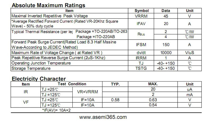 正向输出电流IO:20A; 反向耐压VRRM:45V;
