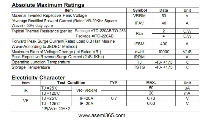 正向输出电流IO:40A; 反向耐压VRRM:60V;