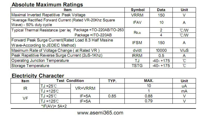ASEMI肖特基二极管MBR10150FCT 中文资料参数介绍: