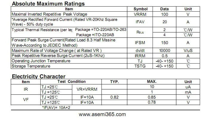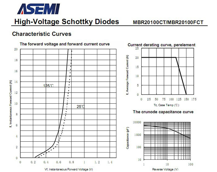 ASEMI肖特基二极管MBR20100FCT 中文资料参数介绍: