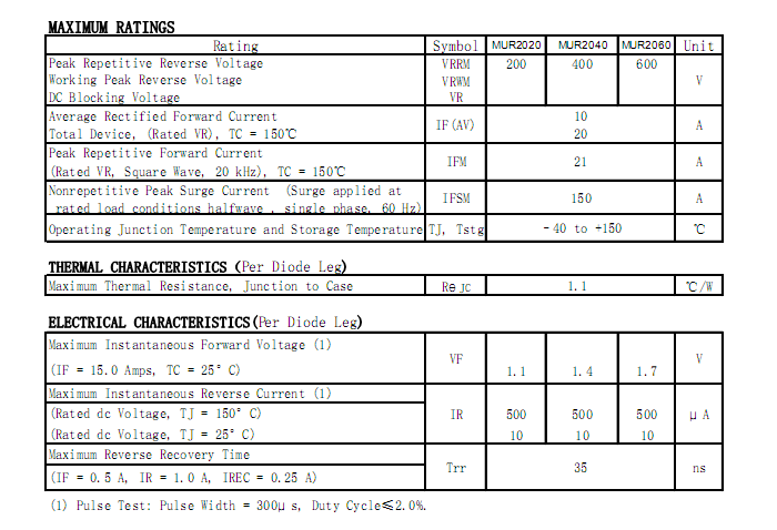 供应MUR2040PT超快恢复二极管详细参数规格