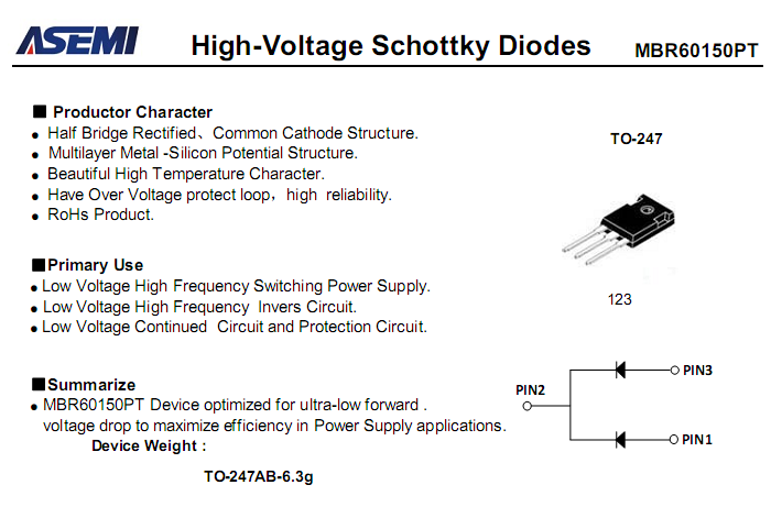 MBR60150PT肖特基相关型号:MBR60100PT、MBR60200PT、MBR6060PT
