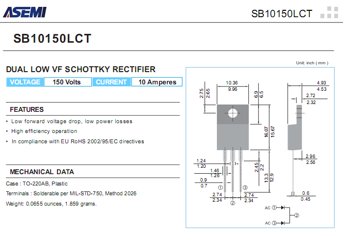 SB10150LCT TO-220 低压降肖特基二极管 PDF资料!