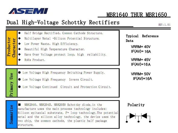 MBR1645CT ITO-220AB肖特基二极管PDF资料